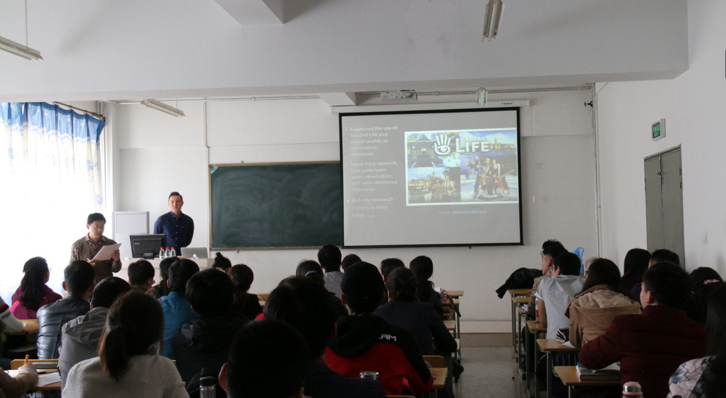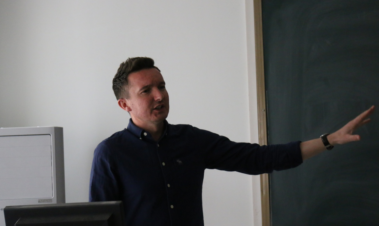 3月27日下午,商学院“双周学术论坛”第一场学术报告会在教学10号楼举行,学院邀请南开大学博士、天津外国语大学Christopher Clarke 为我校师生作了题为《信息科学教学与研究方法探究》的学术报告。商学院副院长周文杰副教授主持报告会并为师生作现场翻译,经济学院、教育学院及我院师生共70余人聆听了报告会。