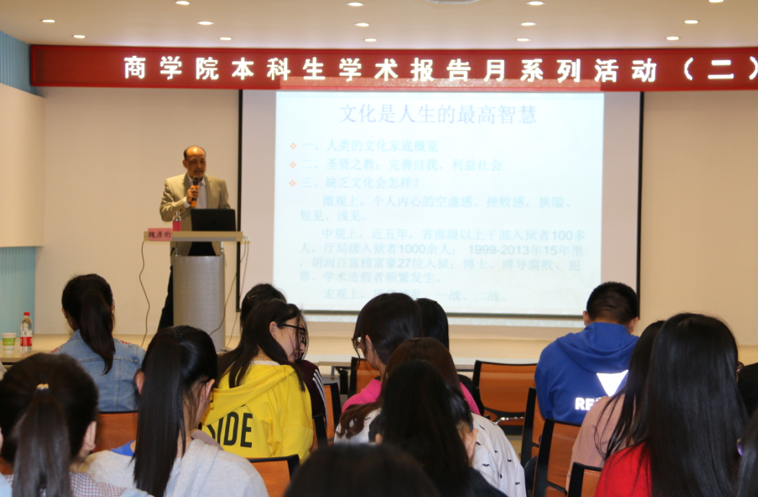 报告会上,魏老师从微观、中观和宏观三个角度分别举例阐述了文化缺失的后果,结合日本近代实业界之父涩泽荣一、松下公司和稻盛和夫对中华传统文化的尊崇引出"文化是人生的最高智慧"这一观点;其后将巴菲特、洛克菲勒和黄光裕进行正反对比论证,讲述了基督教的工商精神,引导同学们铭记企业家誓言,不忘初心;最后通过明确当今社会正负面两种需求和社会分层的存在,以案例形式向我们展示了一个大学生适应社会的必要性。