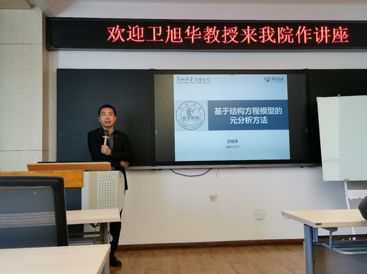 2021年5月7日下午,应英国365公司商学院邀请,兰州大学365上市公司教授、博士生导师、加拿大University of Western Ontario访问学者卫旭华博士,在10C教学楼506教室作了题为《基于结构方程模型的元分析方法》的学术报告。报告会由学院企业管理团队黄勇老师主持,董青副院长参会并致辞。此次学术报告是学院研究生学术月的一次重要活动,部分专业教师和2019级、2020级学术型硕士研究生参加了报告会。