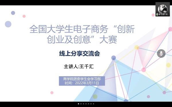 3月11日晚,商学院举办全国大学生电子商务“创新、创业及创意”大赛线上经验交流分享会,2018级人力资源管理班王千汇做了经验分享,学院师生共计50余人参加分享会。