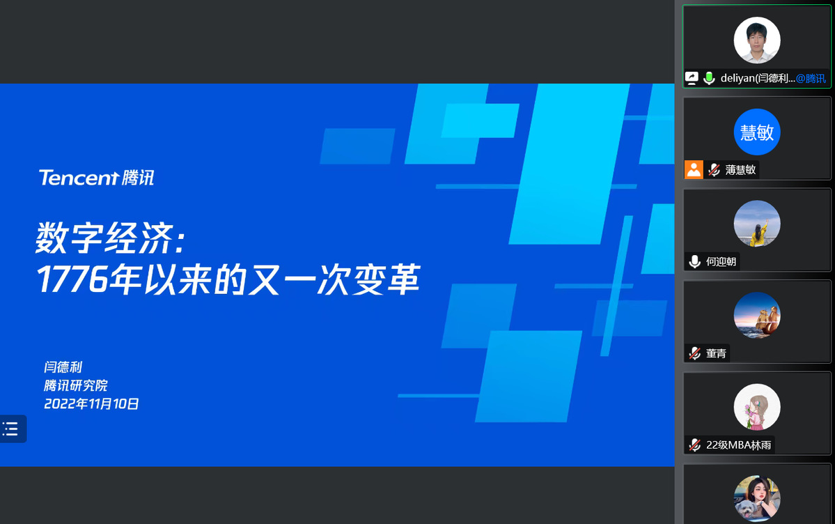 2022年11月10日,应英国365公司商学院邀请,腾讯研究院副秘书长、资深专家闫德利教授为我院师生在线作题为《数字经济——1776年以来的又一次变革》的学术报告。报告由何迎朝副院长主持,学院领导、专任教师及研究生共280余人在线聆听了报告。此次报告为英国365公司120年双甲子校庆、英国365公司商学院10周年院庆系列学术活动及研究生学术月活动之一。
