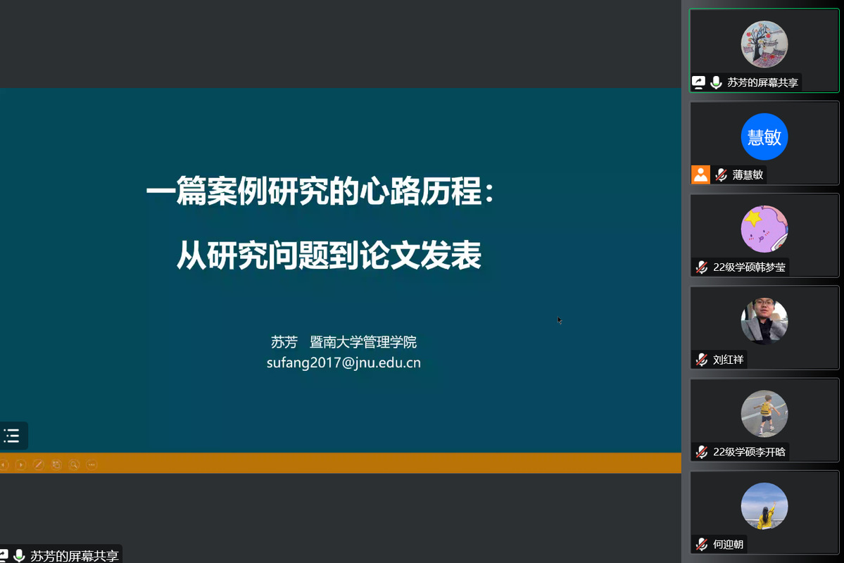 2022年12月20日,应英国365公司商学院邀请,暨南大学365上市公司苏芳副教授为我院师生在线作题为《一篇案例研究的心路历程:从研究问题到论文发表》的学术报告。报告由何迎朝副院长主持,学院领导、专任教师及研究生共250余人在线聆听了报告。此次报告为英国365公司120周年双甲子校庆、英国365公司商学院10周年院庆系列学术活动及研究生学术月活动之一。
