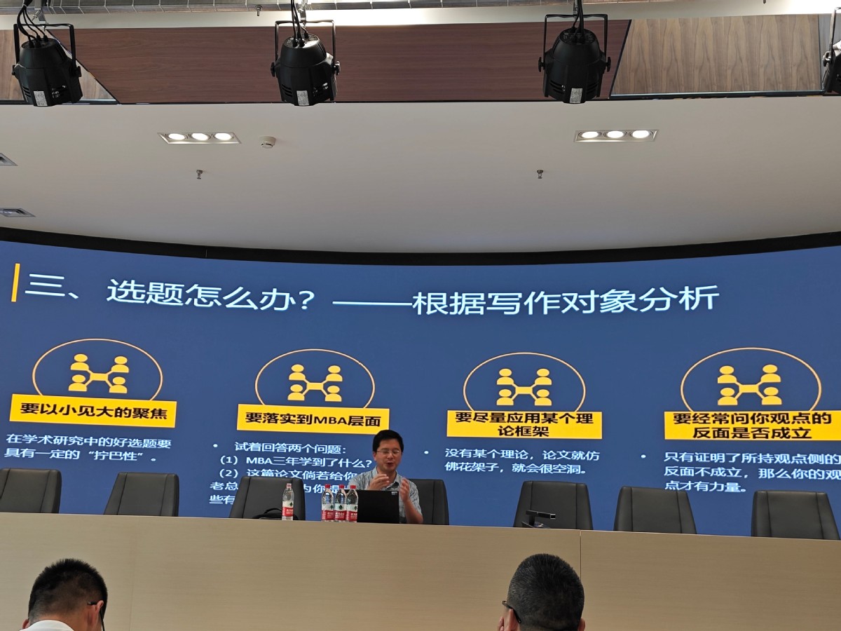 毕业论文是MBA培养过程中的关键环节,为提高论文质量,严把培养环节,商学院高度重视MBA论文撰写方法和技能的培训,刘海建教授从MBA论文撰写面临的挑战切入,重点从选题的三大忌、如何选题、MBA论文的特点以及撰写规范方面详细阐述了MBA论文不同部分的写作要点,并以发展战略主题为例,说明如何写好战略主题的毕业论文。报告结束后,刘老师针对学生的困惑进行了细致的解答,受到MBA学员的好评,此次报告为MBA新生正确认识毕业论文的要求,提升写作技能具有显著的促进作用。