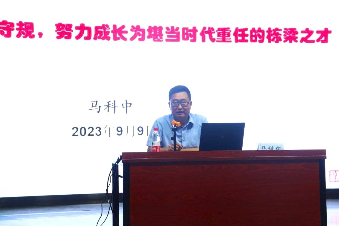 学院党委副书记杨国科做了网络意识形态安全教育、遵纪守法教育、安全防范教育等安全专题讲座,引导新生自觉遵守国家法律法规和校纪校规,牢固树立“安全第一”的思想观念。