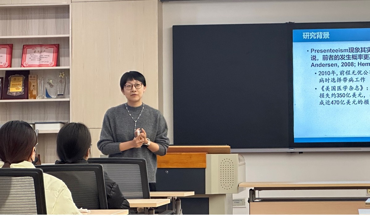 报告过程中,王艳霞副教授首先介绍了出勤主义和缺勤主义的来源和界定;其次详细阐述了出勤和缺勤对个人及组织分别有哪些影响,并结合实践经验介绍了两项研究的具体内容;最后得出研究结论——出勤主义可能在处理身体疼痛方面发挥积极作用,而社会痛苦(即排斥)往往会通过降低员工的自尊心来削弱这种积极作用。报告结束后,学院教师及研究生就研究过程中核心变量的选择、数据收集过程中指标选取原则等问题与王老师进行了互动探讨,王老师均予以耐心、细致的解答。
