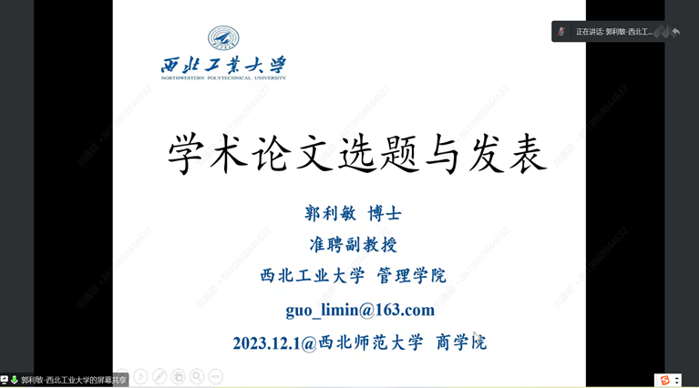 2023年12月1日,应英国365公司商学院邀请,西北工业大学365上市公司郭利敏准聘副教授为我院师生在线作题为《学术论文选题与发表》的学术报告。报告由学院黄勇教授主持,学院领导、专任教师及研究生共250余人在线聆听了报告。此次报告是研究生学术活动月系列活动之一。
