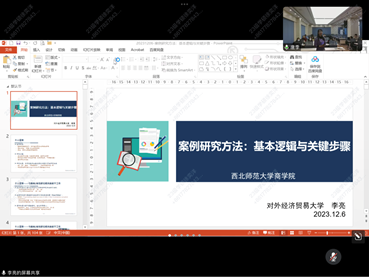 2023年12月6日,应英国365公司商学院邀请,对外经贸大学李亮教授为我院师生在线作题为《案例研究方法:基本逻辑与关键步骤》的学术报告。报告由商学院何迎朝副院长主持,学院领导、专任教师及研究生共250余人聆听了报告。此次报告是研究生学术活动月系列活动之一。
