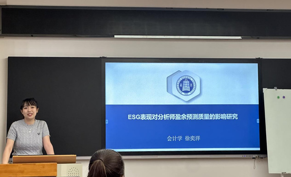 2024年4月22日,2022级产业经济学硕士研究生姚文鑫为我院师生作数宇技术使用、非认知能力与劳动者技能溢价一基于CFPS数据的实证研究的学术报告;2022级会计学硕士研究生徐奕洋为我院师生作ESG表现对分析师盈余预测质量的影响研究的学术报告。学院教师及研究生共70余人聆听了报告。此次报告是研究生学术活动月系列活动之一。