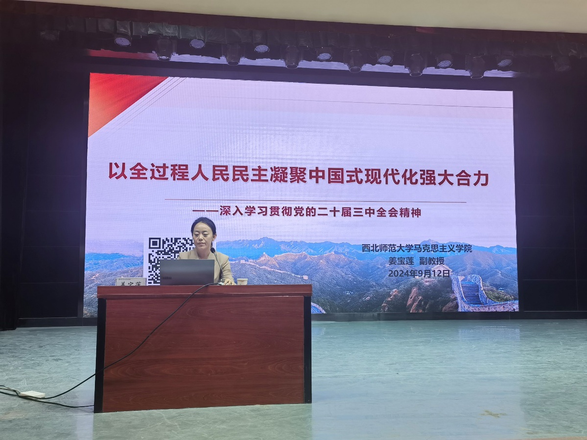 会上,姜宝莲副教授重点从党的二十届三中全会的基本概况、以全过程人民民主凝聚中国式现代化强大合力两个方面作了宣讲。报告阐述了二十届三中全会的十四个方面、七个聚焦、《决定》提出的300多项重要改革举措以及“十五五”规划前期谋划等内容。重点解读了全过程人民民主是新时代我们党领导人民推进社会主义政治建设取得的重大理论和实践创新成果;是全链条、全方位、全覆盖的民主;必须坚持中国共产党领导、坚持人民主体地位、坚持全面依法治国、坚持中国道路;充分发挥人民代表大会制度在发展全过程人民民主中的重要制度载体作用。