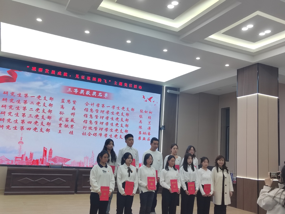 随后,举行了主题作品征集颁奖仪式。研究生第一党支部书记马文静同志为一、二、三等奖获奖作品和优秀组织奖颁奖并合影。本次主题作品征集活动得到了广大党员和入党积极分子的积极响应,共收到了众多优秀作品。经过严格评选,最终评选出一等奖6人,二等奖6人,三等奖12人,优秀组织奖:研究生第一党支部、研究生第二党支部、研究第三党支部、研究生第四党支部。颁奖仪式上,马文静同志对获奖个人和党支部表示了热烈祝贺,并鼓励大家继续努力,为祖国的发展贡献自己的力量。