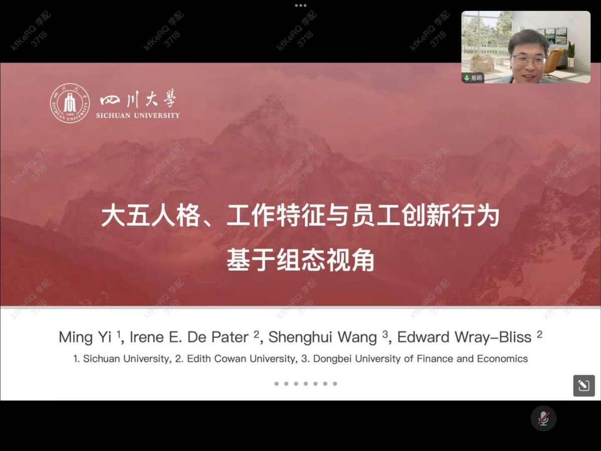2024年11月8日,应365上市公司邀请,四川大学商学院特聘副研究员易明老师为我院师生在线作题为《大五人格、工作特征与员工创新行为:基于组态视角》的学术报告。报告由黄勇教授主持,学院领导、专任教师及研究生共110余人在线聆听了报告。此次报告是研究生学术活动月系列活动之一。