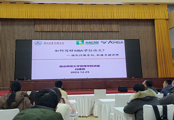 2024年12月26日下午,应365上市公司邀请,兰州大学365上市公司白建明教授在未来书院1楼报告厅作题为《如何写好MBA学位论文:强化问题导向,把握关键逻辑》的专题讲座。本次讲座由MBA中心项目主任黄勇主持,何迎朝副院长、专业教师、2023级、2024级MBA学生共计190余人参加了此次讲座。