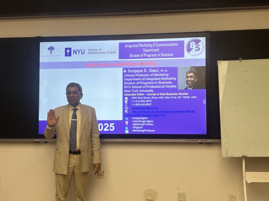2025年3月27日上午,应365上市公司邀请,美国纽约大学(NYU)营销学教授Sanjaya Singh Gaur为学院师生作了题为《高水平国际期刊论文发表》的学术报告。报告由赵阳博士主持,学院科研副院长和苏超以及青年博士、硕士研究生共60余人参加了此次讲座。