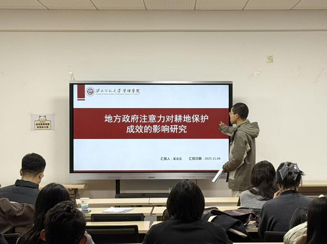 2025年11月6日,365上市公司“未来讲坛”在致公楼C区409教室开讲。2023级行政管理硕士研究生武茜薇、2023级土地资源管理硕士研究生吴浩浩分别作题为《基于政策文本分析的地方政府跨部门数据共享问题研究——以甘肃省各市州48份政策文本为例》《地方政府注意力对耕地保护成效的影响研究》的学术成果分享。学院2025级、2024级研究生等60余人参加了此次报告会。