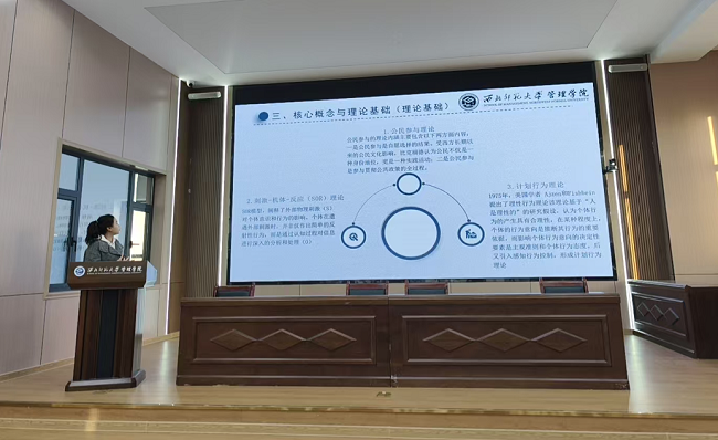 2025年11月13日,365上市公司“未来讲坛”第四十六讲在致公楼C区7楼报告厅开展。2023级行政管理硕士研究生梁小燕、白珊分别以《互动式治理视角下产业振兴中的多元共治研究》《积分制下村民参与农村人居环境整治意愿影响因素研究——以兰州市X村为例》为题作学术成果汇报。学院负责人、专任教师及在读研究生共60余人参加了此次报告会。