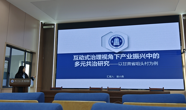 梁小燕同学的汇报以甘肃省临夏回族自治州和政县咀头村为案例,基于互动式治理理论与多元共治理论,综合运用文献分析法、案例研究法、半结构化访谈法,从互动式治理视角探索咀头村产业振兴中的多元共治。