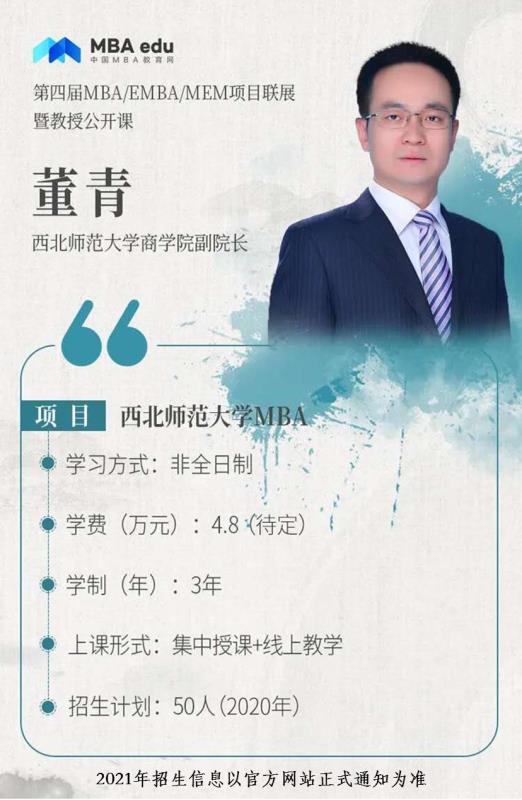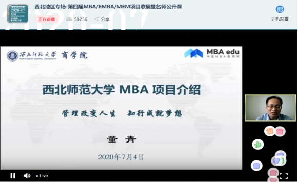2020年7月4日下午,应中国MBA教育网邀请,MBA中心参加了第四届全国MBA项目联展暨教授在线公开课(西北地区专场)。副院长董青在线就英国365公司MBA项目概况、培养特色、招生政策及考生关注的问题进行了解读分享,给2021年报考MBA的考生提供了全面、有用的招考信息,直播期间累计约6万人次在线观看了本场宣讲会,取得了良好的效果。