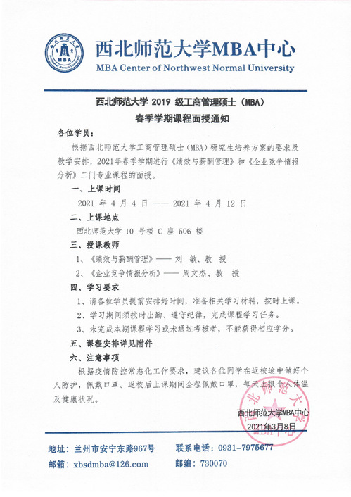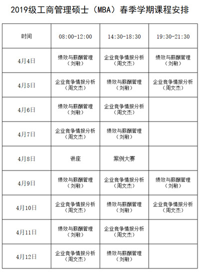 商学院2019级工商管理硕士(MBA)春季学期课程面授通知