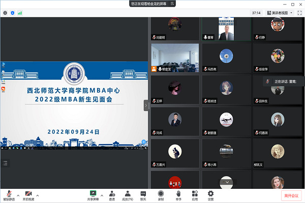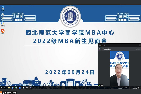 9月24日上午,商学院2022级MBA新生见面会在线举行。商学院党委书记马科中老师、院长董青老师、副院长何迎朝老师、MBA项目主任黄勇老师出席见面会,2022级全体MBA新生在线参加,见面会由MBA中心主任杨金龙老师主持。