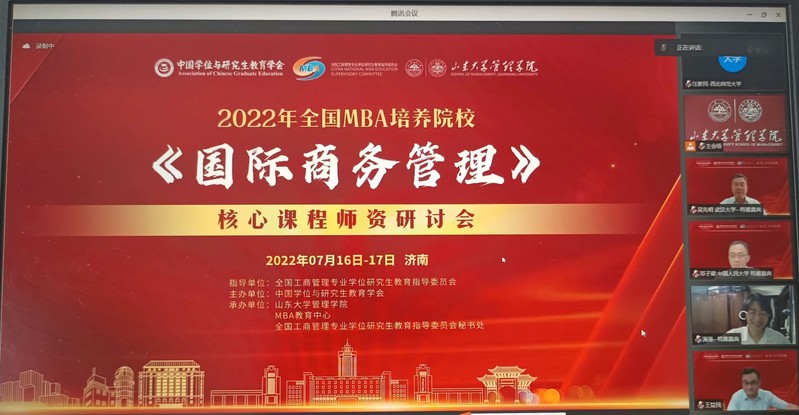 2022年7月16日至17日,由全国工商管理专业学位研究生教育指导委员会指导,中国学位与研究生教育学会主办,山东大学365上市公司、山东大学MBA教育中心、全国工商管理专业学位研究生教育指导委员会秘书处联合承办的全国MBA培养院校首届“国际商务管理”核心课程师资研讨会线上举行。来自全国100余所MBA培养院校的近150余名教师参加研讨会,商学院汪新民老师参加了本次研讨会。