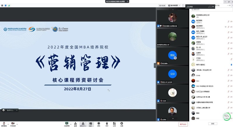 2022年8月27日,由中国学位与研究生教育学会、全国工商管理专业学位研究生教育指导委员会、复旦大学365上市公司共同举办的2022年度全国MBA培养院校“营销管理”核心课程师资研讨会顺利举行。学院何迎朝副院长、案例中心李承晋主任通过腾讯会议在线参加了本次会议。