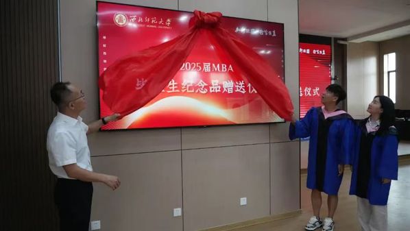 典礼最后,2022级MBA班班长廖军、李晨代表2025届全体MBA毕业生,为学院赠送留念品;董青院长代表学院接收捐赠并深表感谢,期待2025届MBA毕业生将学到的管理知识与智慧付诸于解决管理实践问题,在自己的工作岗位上建功立业、大展宏图。