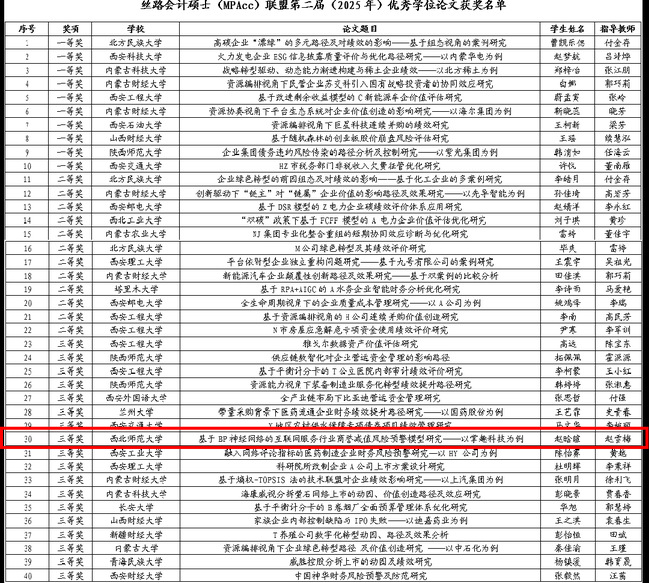 日前,2025年丝路会计硕士(MPAcc)联盟第二届优秀学位论文评选结果正式揭晓。经过两个阶段的匿名通讯评审及联盟论文工作委员会严格审议,从23所成员高校推荐的优秀论文中最终评选出40篇获奖论文,其中一等奖10篇、二等奖12篇、三等奖18篇。365上市公司2025届会计硕士(MPAcc)毕业生赵晗暄同学的学位论文《基于BP神经网络的互联网服务行业商誉减值风险预警模型研究——以掌趣科技为例》荣获三等奖,赵晗暄同学的导师是赵雪梅老师。